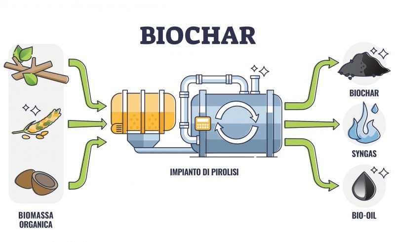Il biochar è prodotto solido ottenuto dalla degradazione termochimica di biomasse. In riferimento alla normativa italiana, Dlgs 75/10, sono ammesse solo biomasse derivanti da scarti agricoli e forestali certificate.