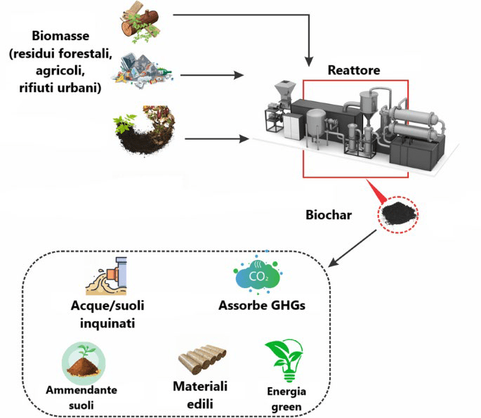 Il 2030 ormai è alle porte, il cambiamento climatico è tangibile, eventi estremi si registrano sempre più frequentemente in ogni parte del mondo, dall’America all’Asia. La causa del fenomeno è attribuita all’emissione costante e spesso incontrollata dei gas serra (green-house -gas GHG), anidride carbonica (CO2) e metano (CH4), ma determinanti sono anche l’inquinamento di falde acquifere e suoli, che insieme alla cementificazione e deforestazione danneggiano gli ecosistemi terrestri. Di fronte a questa crisi globale la comunità scientifica si è impegnata a individuare soluzioni per mitigare il danno antropico. Tra queste il biochar, sta attirando sempre più l’interesse del mondo della ricerca e dell’industria. Questo materiale sembra dimostrarsi una valida strategia per sottrarre CO2 atmosferica, purificare acque e suoli e limitare il ricorso alle fonti fossili.