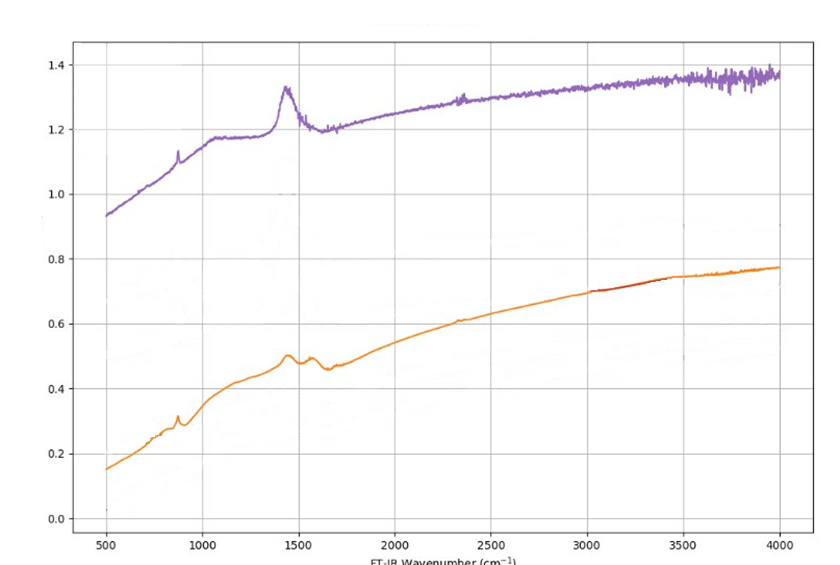 Figura 3 – Spettri FT-IR appartenenti a 2 biochar derivanti da processi termochimici differenti: il BC5 (arancione) da pirolisi lenta Tmax. =550° C e il BC7 (viola) da pirogassificazione Tmax. 850° C.
