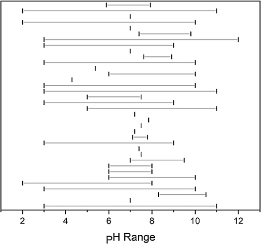 Figura 2- intervalli di pH individuati dai diversi studi che hanno indagato sulle capacità del biochar di rimuovere i PFAS. (Nasrollahpour et al., 2025)