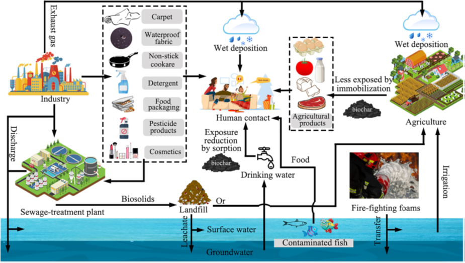 Figura 1- Fonti antropiche di PFAS e il possibile uso del biochar per la rimozione di questi dagli ambienti acquatici e suoli. (Immagine ripresa da Liang et al. 2024)