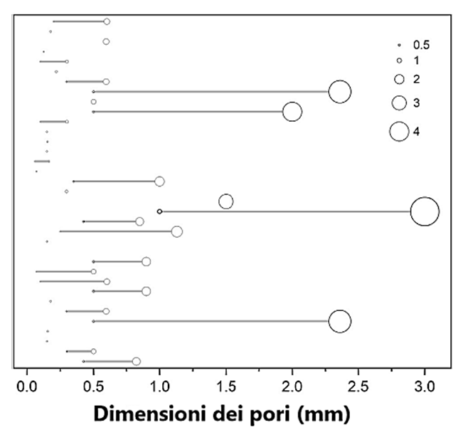 Figura 3- Dimensioni delle porosità dei biochar riportate in letteratura nelle prove di adsorbimento di PFAS. (Nasrollahpour et al., 2025)